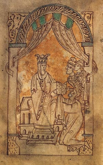 The miniature is from the only medieval manuscript of the Encomium Emmae Reginae and probably was made for the queen herself. It shows Emma receiving a copy of the work from its author, a Flemish monk. On the right are her sons Harthacnut and Edward.