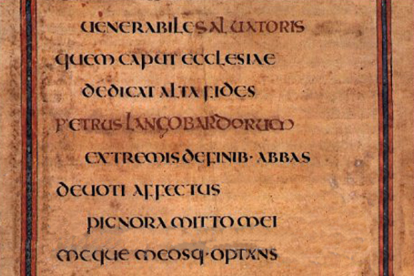 The elegant uncial (capital) script is written in two tall columns and follows the Vulgate of Jerome, of which the Codex is the oldest and best example. Ultra-violet photography shows the dedication page pictured above to be identical to the preface quoted in the anonymous Life of Ceolfrith, except that Petri and Ceolfridus Anglorum have been erased and Petrus Langobardorum, Peter of the Lombards, substituted to allow that abbot to present the massive tome as his own gift to the monastery of St. Savior (Salvatoris) at Monte Amiata near Siena.