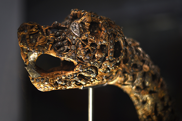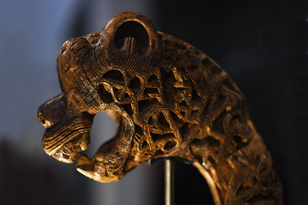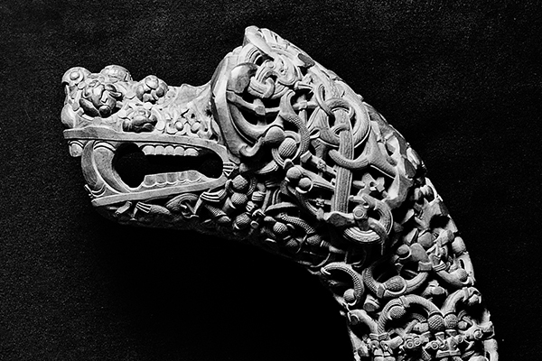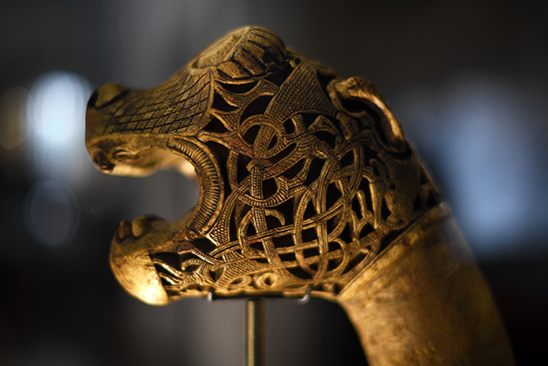 The detail of a dragon (top) is from the Sutton Hoo burial and is one of the mounts on an elaborately decorated shield. Both the burial and Beowulf may date to the eighth century AD. The Oseberg ship and its treasures were buried perhaps a century or so later.