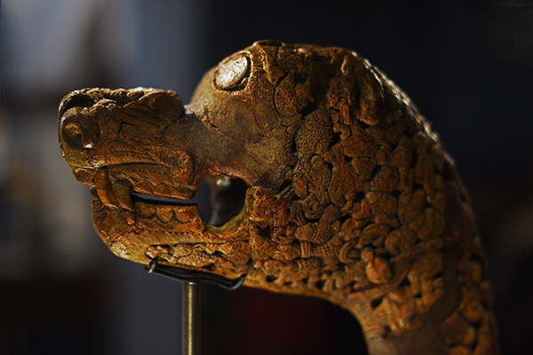 When the Oseberg ship was discovered in 1904, five carved dragon heads were found onboard, four of which are displayed in the Viking Ship Museum (Oslo) and the fifth in storage. Four were found in the burial chamber of the ship, each of which had an iron rattle attached to a rope, which suggests that they were displayed in a religious procession as part of a burial ritual or perhaps used as a talisman, their apotropaeic effect (from the Greek "turning away") intended to ward off evil. With remarkable foresight, these heads remained submerged in tanks of water for fully half a century until a proper method of conservation could be found.