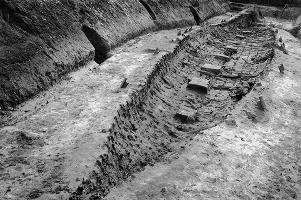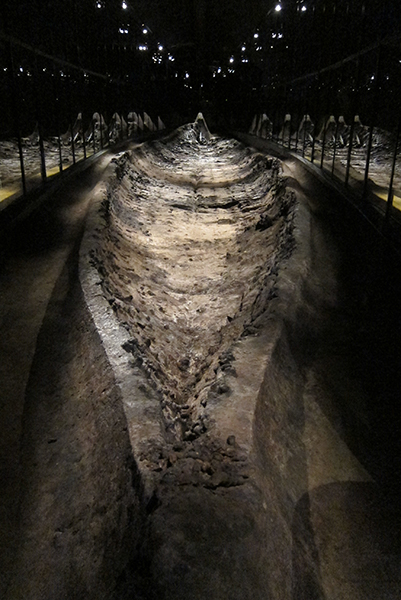 Four years later, in 1939, the impression of an older ship was discovered at Sutton Hoo on the Suffolk coast of England, only its rivets and ribs imprinted in the sand. Less than three months later, World War II began and the mound was covered again, for fear that it might be damaged by German bombs. Now only the Ladby Ship still can be seen in situ, still resting in its barrow.