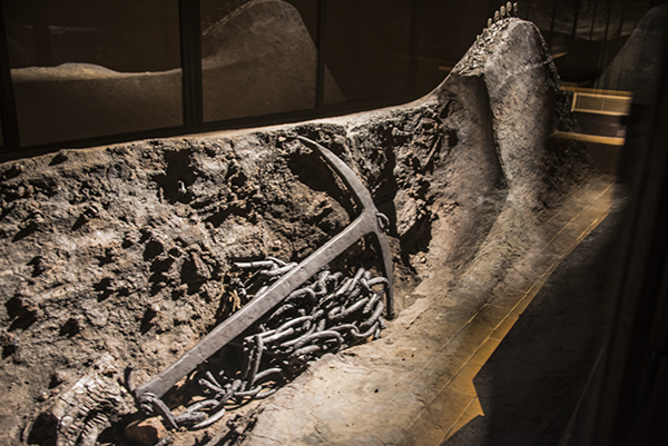 Next to a horse's jaw, an iron anchor lies in the bow of the ship, the largest one from Scandinavian antiquity, and its 36-foot-long chain the only know example. Two swivels allowed the chain to twist without kinking and a hook permitted the length to be adjusted, depending upon where the ship was anchored. Once, there had been a wooden stock fitted at right angles to the flukes so that, when the anchor came to rest, the arms would secure a hold on the bottom. The chain itself was attached to a length of rope fastened to the ship.