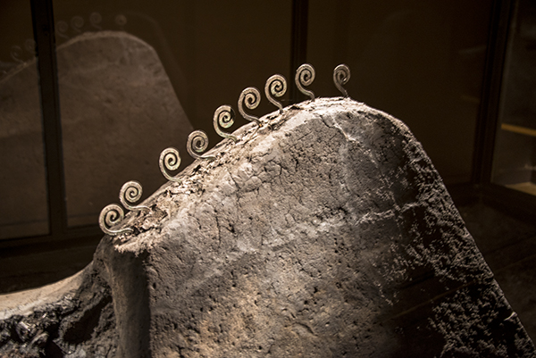A series of small iron spirals originally were fitted to a dragon's head at the bow in imitation of its mane. At the stern, an iron band tipped with spear-head like spikes represented the scales of the dragon's tail. The wooden head itself has rotted away but likely was loosely fitted to the stem of the ship.