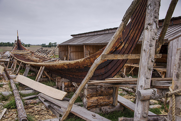 In the summer of 2011, an exact copy of the ship was begun, using traditional Viking building techniques and split oak logs from a local forest. Barely visible in its frame, the stems of the ship are stepped so that the strakes can fit neatly into place. This picture was taken in 2013, when construction had reached the meginhufr.