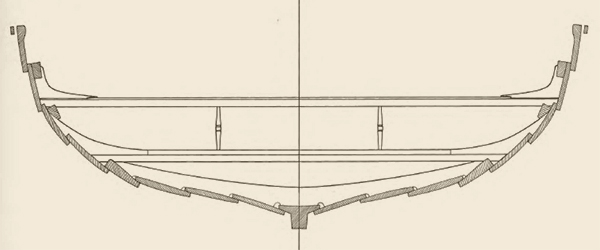 The reconstruction of the Ladby ship (based on other Viking-Age finds) can better be understood if presented in cross-section. Overlapping oak strakes or planks were riveted with clench-nails and caulked in between with twisted wool or cow hair dipped in pitch. The two bottom planks were secured to notched floor timbers by treenails (wooden pegs) and spiked to the third and fourth strakes. This last strake, which ran along each side at the waterline, was called the meginhufr ("strong plank") and strengthened the ship longitudinally at its point of greatest stress. Crossbeams or thwarts fitted over the ribs provided diagonal support to the frame and were secured by spikes to curved knees that themselves were attached to the strakes by treenails. Long stringers further reinforced the upper strakes where they overlapped. Over these beams, there was a deck of loose boards.