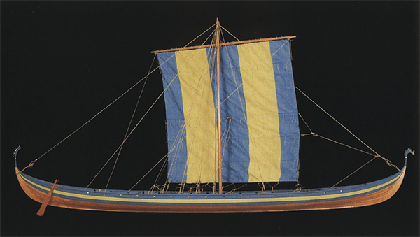 Three years later, the newly-christened Ladby Dragon was launched, painted in the yellow and blue that were found as traces of color at the burial site. The mast and rigging were added in 2017 and the ship now is docked at the Viking Museum, Ladby. The model also gives an impression of another, smaller Viking ship, Skuldelev 5 which it most closely resembles.