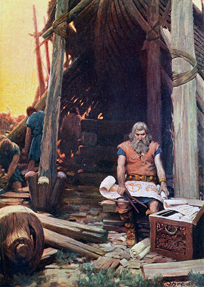 The image (top) is from a bed found on the Oseberg Ship, the dragons that frame the headboard offering protection to the sleeper flanked between them. The illustration is from The Children's Longfellow, published in 1908, and shows the Long Serpent on its stocks while Thorberg ponders over plans for the ship. In fact, Viking society largely was illiterate and shipwrights fashioned their longships, not to drawn plans or fitted molds, but by eye and tradition.
