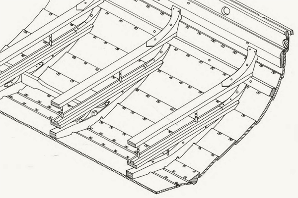 All this is visualized more readily by the reconstructed cross-section of the hull from Crumlin-Pedersen. On the upper edge of the sheer strake (the uppermost one), a small section of shield-rack is preserved, which allowed shields, held high by their bosses, to be slotted between the rail and the side of the ship. But they are positioned in such a way that the oarports are obstructed, which suggests (on Skuldelev 5 at least) that the shields were placed outboard only when the ship was under sail or riding at anchor. Unlike the other planks, the sheer strake was not reinforced, either by stringers or knees, so it could be more easily replaced when worn or damaged.