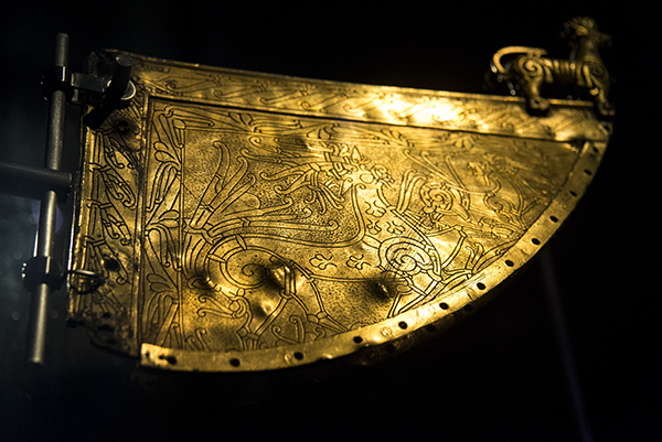 This gilt copper weathervane is from the medieval church of Heggen in Modum, Norway and was acquired there from a private collection in 1921. It dates from the first half of the eleventh century and once had decorated the prow of a Viking ship, the dents in the metal likely from the impact of arrows. Hung from a metal rod, the vane was free to rotate, the pierced holes along the edge holding ribbons or streamers (or even thin metal leaves). When fitted to the curved stem, the vane would have tipped forward and its slight upward angle become horizontal again. Two lions are depicted, one large and one small, theirs mane and tails an elaborate spray of tendrils.