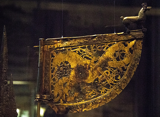 Dating to the same period, this openwork gilt copper vane is from the church at Söderala on the eastern coast of Sweden and discovered in 1916. Although less dramatic, it too has impact marks. The brass lion, which had become detached, was found next to the church, although its tail is missing.