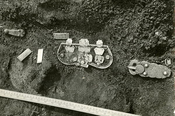 That Sutton Hoo is a royal burial can be seen in the objects discovered in the resplendent chamber constructed amidships. The interior seems to have had been covered with a rug or mat on which were placed the possessions of a pagan warrior king: his helmet and coat of mail, sword and shield, spears and a unique axe-hammer, as well as the magnificent gold-and-garnet purse lid, shoulder-clasps, and a great gold buckle (see the archival photograph above). There also were two unique, but enigmatic, symbols of his power: a whetstone "scepter" surmounted by a small bronze stag on a ring and a mysterious iron stand that may have served as a standard for the king.