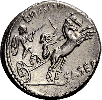 The denarius above was minted by the moneyer Lucius Hostilius Saserna in 48 BC, following Caesar's campaign in Gaul and is from Numismatica Ars Classica, Auction 52 (October 7, 2009), item 867. The reverse depicts a naked Celtic warrior holding a spear and small shield, while a crouched figure drives the horses with a whip. One can see that the charioteer is driving the horses from the pole and that the sideboards are quite low. The open front makes it that much easier for the warrior to leap onto the pole himself.