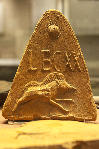 The Twentieth Legion was one of four (II Augusta, IX Hispana, XIV Gemina, XX Valeria) that took part in the invasion of Britain in AD 43. Based at Colchester, it was transferred in AD 49 to a site near Glevum (Gloucester) to help put down the Welsh tribes. The abandoned legionary fortress then became the foundation for Colonia Claudia, the first provincial capital of Britannia. Legio XX subsequently played an important role in the campaigns of Agricola and finally was stationed at Deva (Chester). The legionary emblem (above) was a charging wild boar, as can be seen in this antefixa (decorative gable end) in the British Museum.