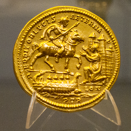Part of a treasure hoard found at Beaurains near Arras, France in 1922, the medallion depicts on the reverse the personification of London kneeling before the city gate, which is approached by a Roman warship. Having defeated the usurper Allectus, Constantius is portrayed mounted on horseback in the guise of a triumphant emperor, holding a spear in one hand and a globe in the other, with the inscription REDDITOR LVCIS AETERNAE ("Restorer of Eternal Light").