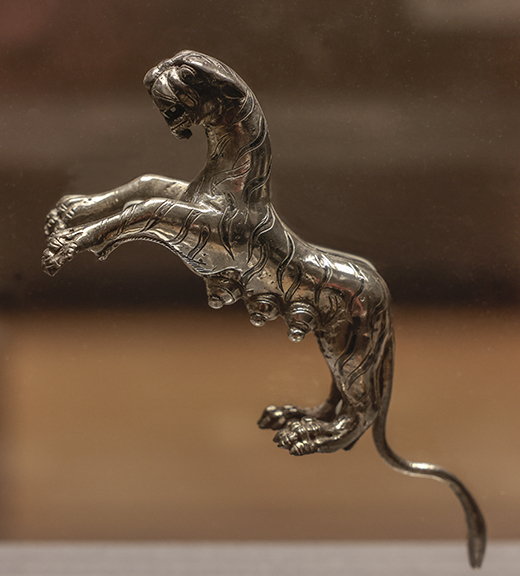 This beautiful solid silver statuette is one of what must have been a pair of detached handles from a vessel that was not found. Large felines such as panthers and tigers were associated with Bacchus, the god of wine, and the missing piece likely was decorated in the same fashion.