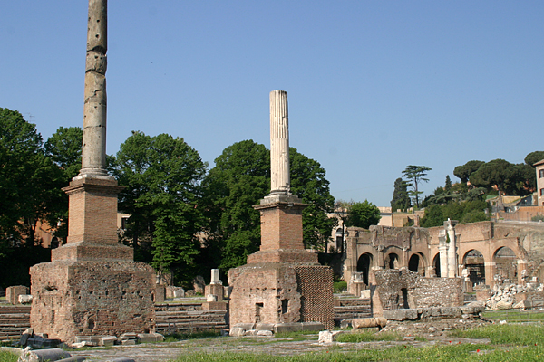 Five honorary columns were added behind the Rostra in AD 303 and, to provide symmetry, a new rostra, with a corresponding number of columns, was placed at the opposite end of the Forum in front of the Temple of Divine Julius. This shortened the Forum square and shifted emphasis to the newly restored Basilica Julia and Senate House. Joining both rostra were seven honorary columns, two of which are pictured above, that ran in front of the Basilica. A single larger column (which later was reworked as the Column of Phocas), presumably honoring Diocletian, himself, was placed on an axis with the Argiletum, the throughfare that ran along the Curia, which now became the main approach to the Forum.